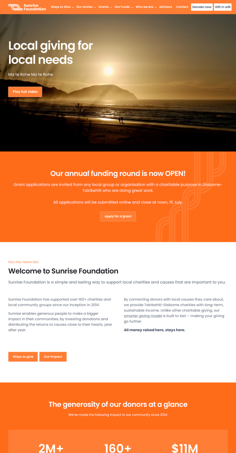 Sunrise Foundation has been connecting generous people with causes that matter in the Gisborne-Tairāwhiti region since 2014. Working with the great team at Sunrise Foundation, and talented designer Luke McArthur, we put together this great new site to showcase everything that Sunrise does in the community.